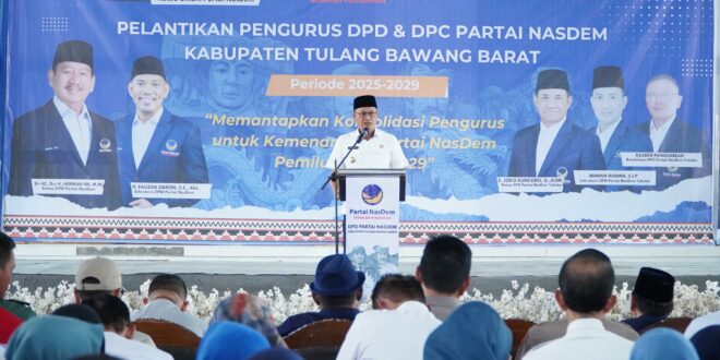 Tulang Bawang Barat, intermedianews.co.id–Bupati Tulang Bawang Barat (Tubaba), Ir. Novriwan Jaya, S.P., menghadiri Pelantikan Pengurus Dewan Pimpinan Daerah (DPD) dan Dewan Pimpinan Cabang (DPC) Partai NasDem Kabupaten Tulang Bawang Barat Periode 2025–2029. Kegiatan tersebut digelar di GOR Z.A. Pagar Alam, Kagungan Ratu, Rabu (28/01/2026).