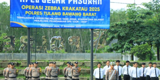 Tulang Bawang Barat, intermedianews.co.id-– Kapolres Tulang Bawang Barat, Polda Lampung AKBP Sendi Antoni. S. I.K., M.I.K., memimpin langsung apel gelar pasukan dalam rangka Operasi Zebra Krakatau 2025, bertempat di Lapangan Upacara Mapolres Tubaba, Senin (17/11/2025)