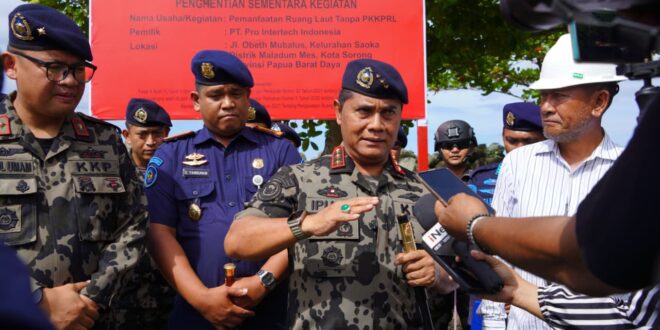 Sorong Papua, intermedianews.co id–Kementerian Kelautan dan Perikanan (KKP) menghentikan kegiatan pemanfaatan ruang laut tak berizin di Saoka, Sorong, Papua Barat Daya. Hasil pemeriksaan oleh Polisi Khusus Wilayah Pesisir dan Pulau-Pulau Kecil (Polsus PWP3K), pihak perusahaan tidak memiliki dokumen Persetujuan Kesesuaian Kegiatan Pemanfaaran Ruang Laut (PKKPRL) dengan peruntukan terminal khusus (tersus).
