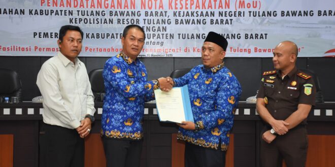 Tulang Bawang Barat, intermedianews.co.id–Pemerintah Kabupaten Tulang Bawang Barat (Tubaba) mengambil langkah tegas dan strategis untuk menyelesaikan masalah agraria yang telah menahun. Hari ini, Bupati Tubaba, Ir. Novriwan Jaya, S.P., memimpin penandatanganan Nota Kesepakatan (MoU) antara Pemkab Tubaba, Kantor Pertanahan, Kejaksaan Negeri, dan Kepolisian Resor setempat. Bertempat di Ruang Rapat Bupati, Senin (10/11/2025).