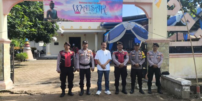 Tulang Bawang Barat, intermedianews.co.id—Dalam rangka mendukung kelancaran peringatan perayaan Hari Tri Suci Waisak 2569 BE/2025 di Kabupaten Tubaba, Polsek Tulang Bawang Tengah Polres Tubaba Polda Lampung memberikan pengamanan maksimal bagi umat Buddha yang melaksanakan peringatan Hari Tri Suci Waisak, Pengamanan ini dilakukan untuk mengantisipasi potensi gangguan keamanan dan ketertiban masyarakat (kamtibmas) selama berlangsungnya kegiatan, Minggu (18/05/2025).